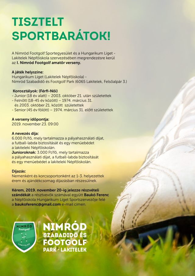 A Nimród Footgolf Sportegyesület és a Hungarikum Liget – Lakitelek Népfőiskola szervezésében megrendezésre kerül az I. Nimród Footgolf amatőr verseny.